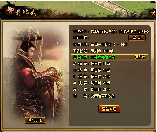 每周一至周五的0点-24点为报名阶段,每周六0点-24点为淘汰阶段,32强赛开始之前进入支持阶段,每位玩家可以可以投票支持32强中喜爱的选手,若支持的选手获得冠军,玩家也可以得到丰厚的奖励。