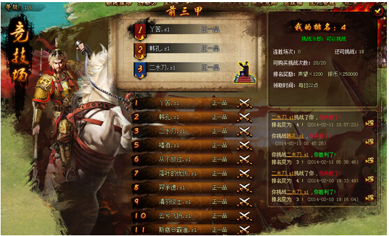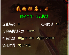 点击图标即可进行挑战,每天可以挑战其他玩家二十次,挑战不论输赢都能获得银币的奖励,每天晚上的十点,玩家还能根据自己的排名,领取固定的排名奖励,