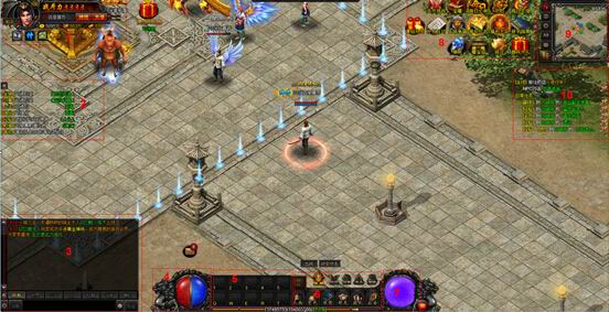 区域6:游戏功能,包括人物信息、背包、技能、好友、组队、公会等。