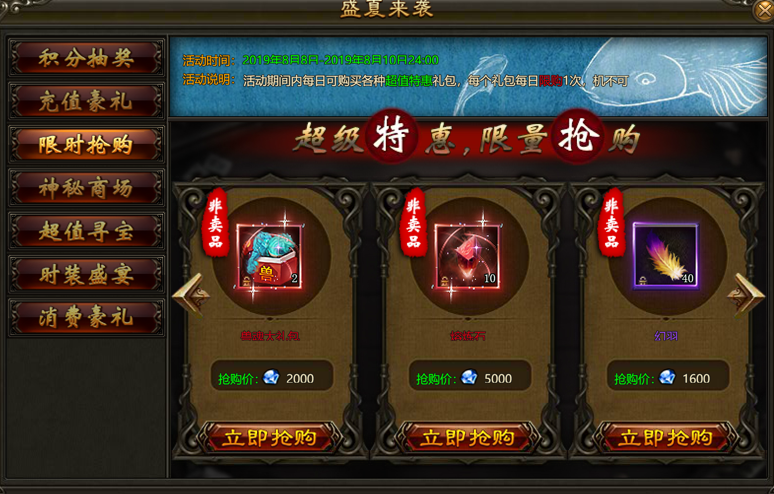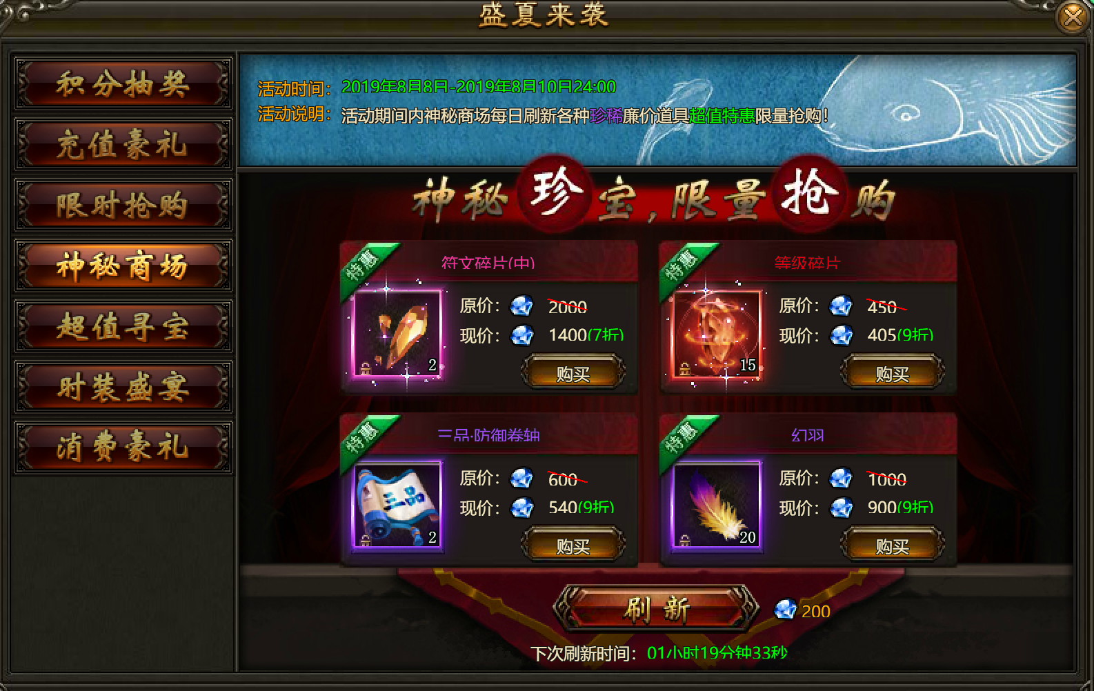 2. 活动期间内,神秘商场每日刷新各种珍稀道具,打折出售限量抢购。