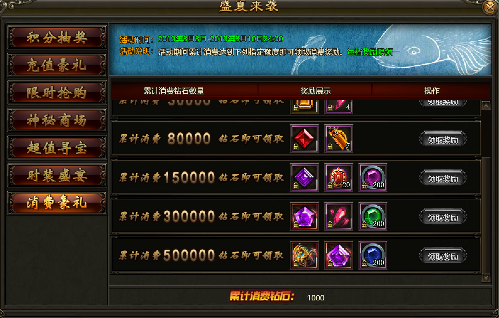 2. 活动期间内,消费指定档次的钻石可免费领取超级豪华礼包,更有灭神首饰箱、高级攻击宝石、韧性宝石、九霄妖核、救赎妖核等稀有道具