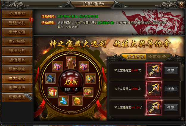 规则:在神之宝藏中寻宝达到对应次数即可获得魔龙密钥,使用魔龙密钥可以开启魔龙秘宝获得超级大奖!