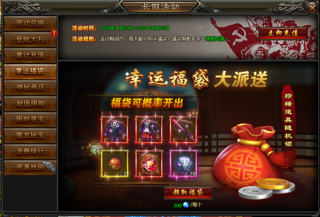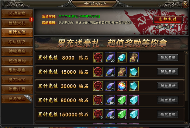 规则:活动期间内累计充值打到对应档位可领取丰厚奖励