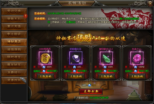 规则:每隔2小时神秘商店将会刷新各种市面上难以获取的珍贵物品