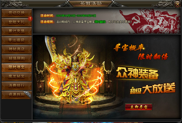 规则:活动期间,神之宝藏中众神装备寻宝概率翻倍。