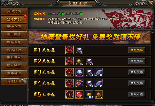 规则:活动期间内登录即可领取登录奖励,登录满5天即可领取所有奖励