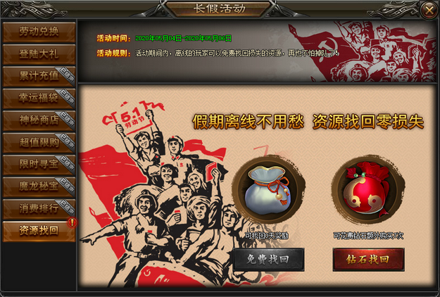规则:活动期间消未上线可免费找回基础日常奖励,花费钻石可获得更多日常奖励