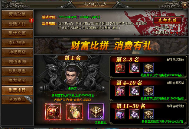 第1名:只有1个名额,需消费30万钻石,获得高级武器/衣服自选箱*1,超级战神油*1,元宝匣*100