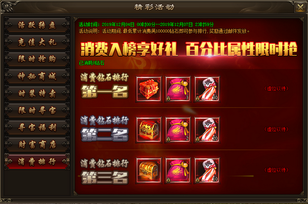活动内容:活动期间,最低累计消费满100000钻石即可参与排行,排行前3名可获得超级大奖。奖励将在活动结束后通过邮件发放。