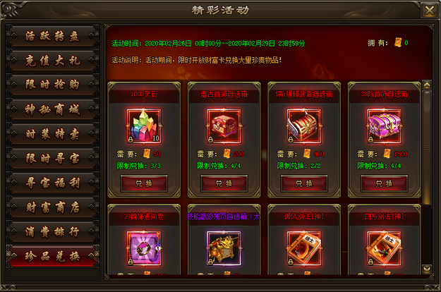 活动说明:活动期间将限时开放珍品兑换,可以使用财富卡兑换阵法道具,[神]技能书。