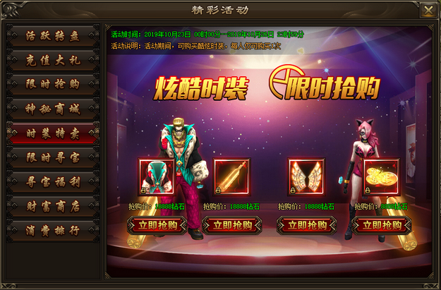 活动内容:活动期间,可购买酷炫时装,每人仅可购买1次。