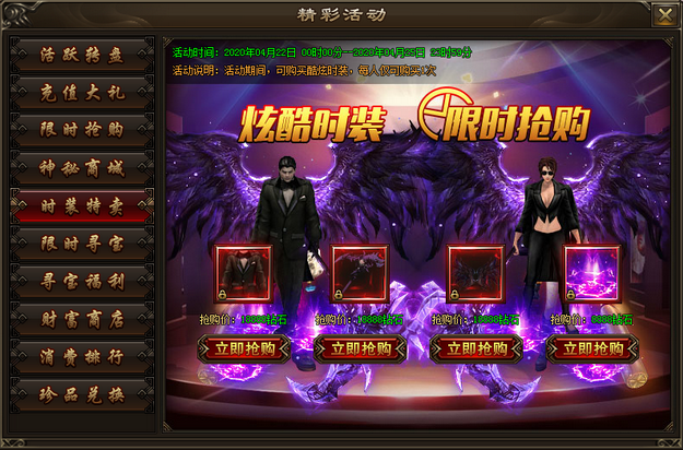 活动内容:活动期间,可购买酷炫时装,每人仅可购买1次。