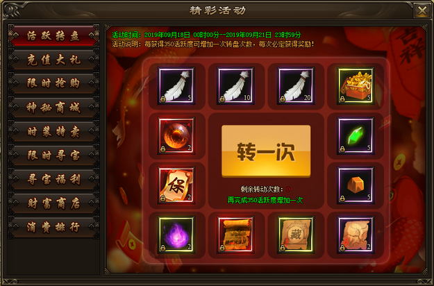 活动内容:活动期间,每获得350活跃度可增加一次转盘次数,每次必定获得奖励。