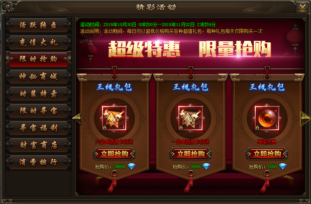 活动内容:活动期间,每日可以超低价格购买各种超值礼包,每个礼包每天限购一次。