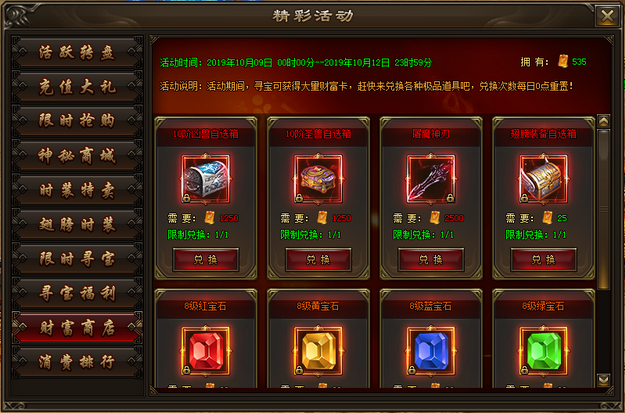 活动内容:活动期间,寻宝可获得大量财富卡,使用财富卡可在财富商城兑换海量极品道具。