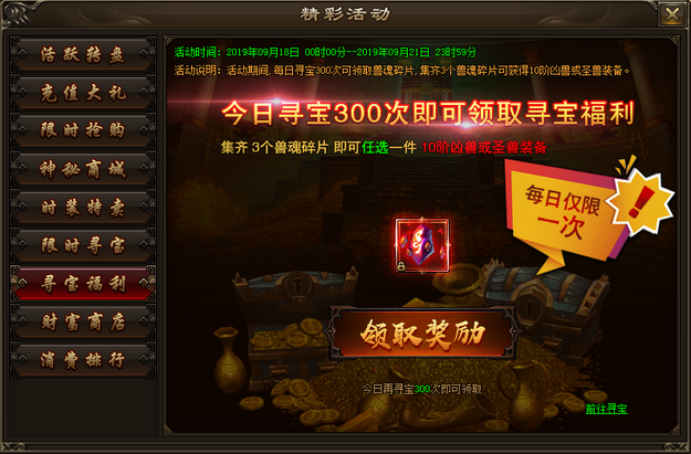 活动内容:活动期间,每日寻宝300次可领取兽魂碎片,3个兽魂碎片可合成兽魂自选袋,可任选一件10阶凶兽或圣兽装备,每日仅限领取1次兽魂碎片。