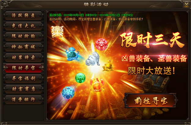 活动内容:活动期间,寻宝新增圣兽装备、凶兽装备,极品装备拿到手软!