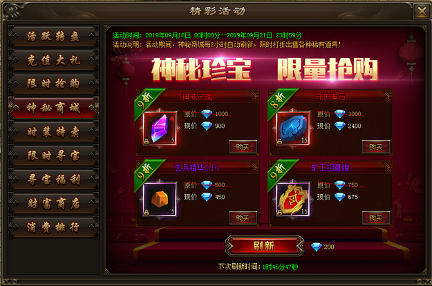 活动内容:活动期间,神秘商城每2小时自动刷新,限时打折出售各种稀有道具!