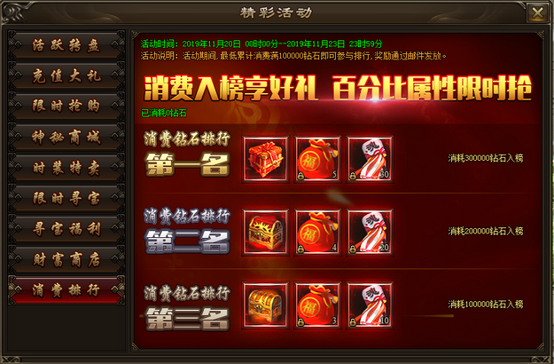活动内容:活动期间,最低累计消费满100000钻石即可参与排行,排行前3名可获得超级大奖。奖励将在活动结束后通过邮件发放。