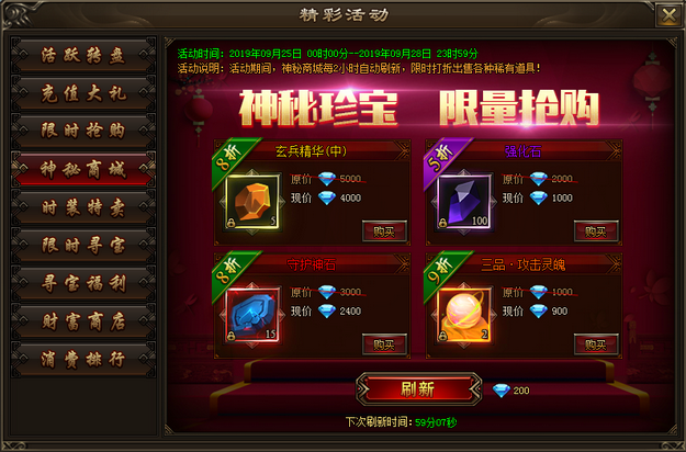 活动内容:活动期间,神秘商城每2小时自动刷新,限时打折出售各种稀有道具!