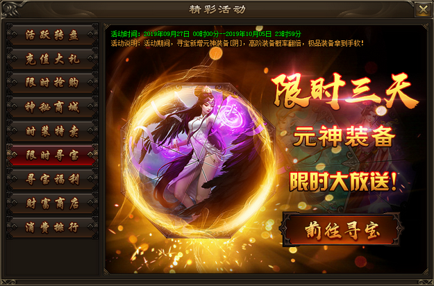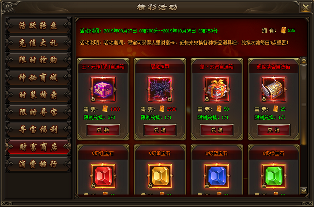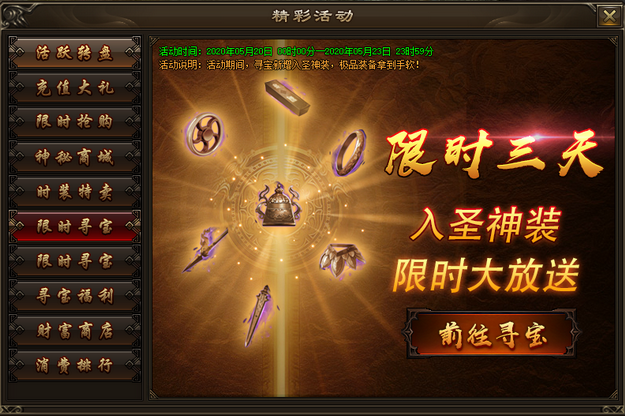 活动内容:活动期间,寻宝可获得大量财富卡,使用财富卡可在财富商城兑换海量极品道具。