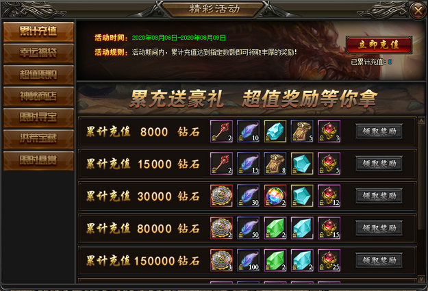 充值150000钻石:侠之魂*25,寻宝罗盘☆暗影*3,幻羽*100,7级生命宝石*2,7级韧性宝石*2。