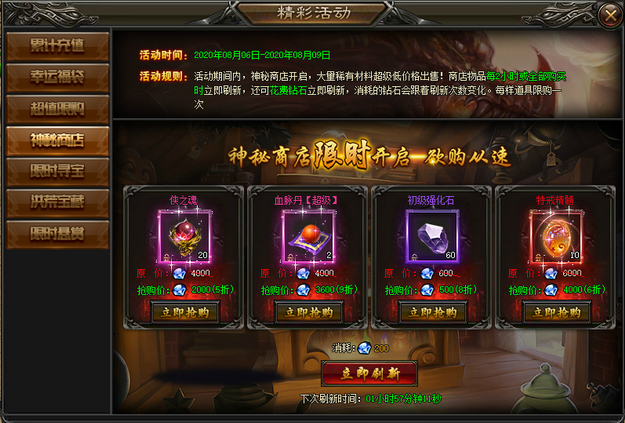 规则:每隔2小时神秘商店将会刷新各种市面上难以获取的珍贵物品