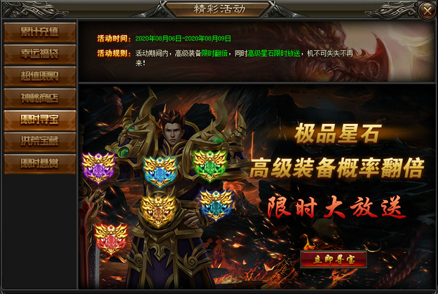规则:活动期间,神之宝藏中高级装备抽取概率翻倍,同时有几率抽取高级星石。