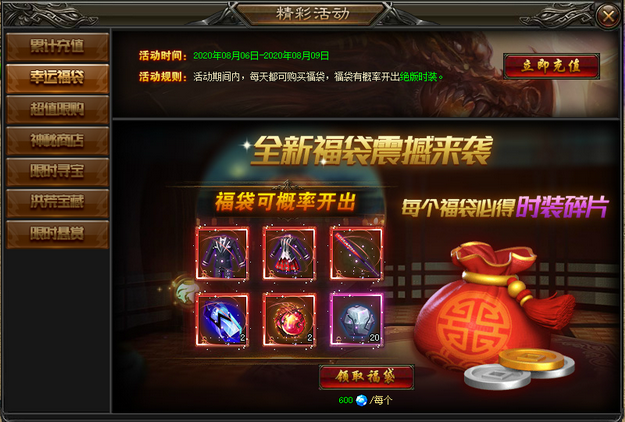 规则:可花费钻石购买福袋,每个玩家每天最多可购买20个。
