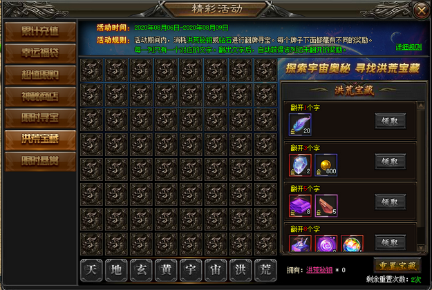 1.消耗洪荒秘钥或钻石翻牌可以获得各种奖励