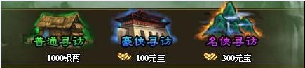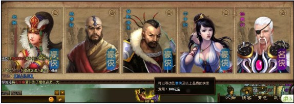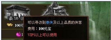 2、豪侠寻访:VIP1以上使用,每次消耗100元宝,可以获得豪侠及以上品质侠客。