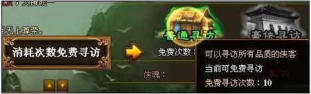 1、普通寻访:每日免费寻访10次,随着VIP等级上升,免费寻访次数增多,免费次数后寻访小号1000银两,非VIP玩家寻访一次后有10分钟的冷却时间才可以进行下次免费寻访。普通寻访可能获得任意品质的侠客,但是获得高品质侠客的几率会相对较低。想快速获得高品质侠客,就使用豪侠寻访、名侠寻访。