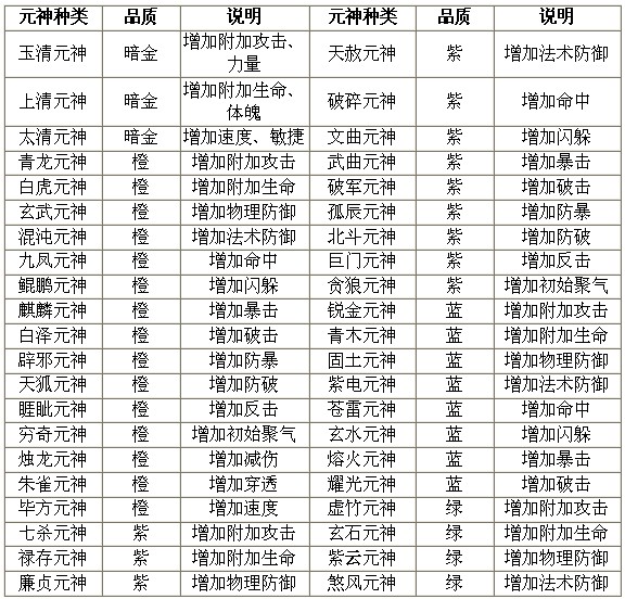 元神的品质:凡品(绿)<良品(蓝)<上品(紫)<仙品(橙)。根据品质的提升属性加成也对应提升,且升级时每一级所需经验不同