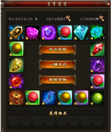 若过展示的抽取物品不符合您的要求,可以无限次免费使用“刷新宝物”功能,刷到您满意为止。每次开启都需要消耗一定数量的至尊钥匙,连续开启需要消耗更多的钥匙,但有更高几率获得稀有物品。“刷新宝物”可以清除连续开启的次数。