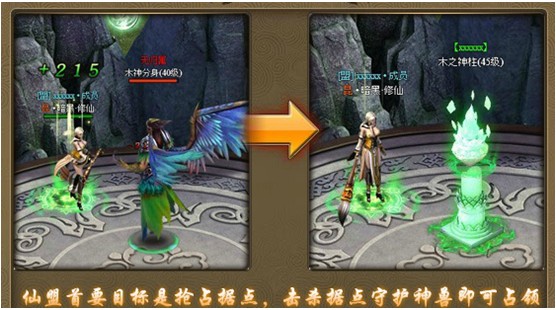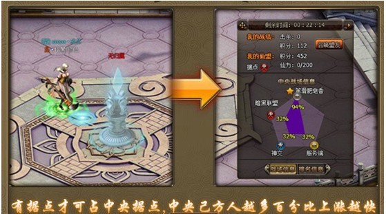 2> 玩法首要是要抢占靠近地图中央的五行据点,击败据点的守护兽或者击败据点的神柱后可以占领据点。占领后可就近复活,优势非常明显。