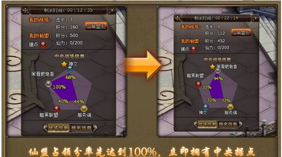 4> 第一个占领进度达到100%的仙盟可以占领中央据点,所以务必把其他仙盟的玩家清理出中央区域,不要别人先到100%。占领中央或五行据点的仙盟成员每间隔一段时间都可以获得一定的积分奖励。