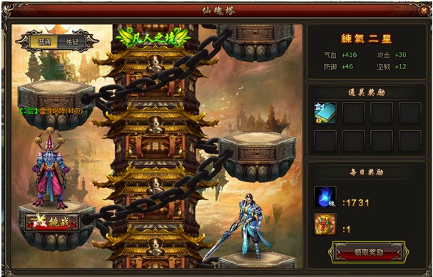 3. 每日奖励:每天可与从仙魂塔中获得一定数量的仙魂(提升技能等级)和仙魂塔礼包(可开出大量稀有材料)