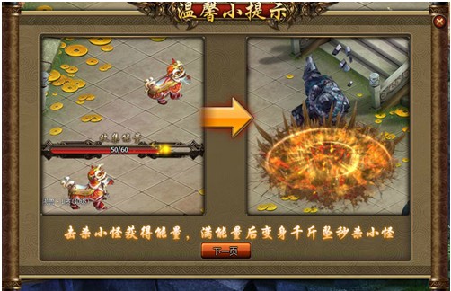 击杀小怪可获得能量点,集满能量可触发强力技能【千斤坠】,可秒杀其砸向的小怪哦!