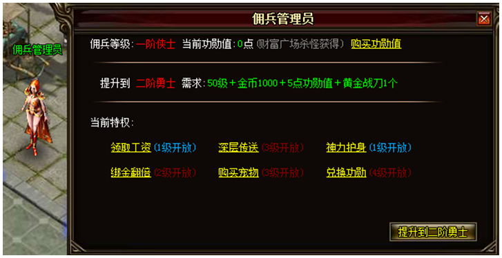 佣兵功能总览:佣兵可以升阶,需求一定的人物等级、金币、功勋值和指定装备等资源。