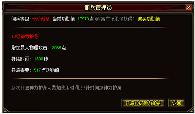 神力护身功能(1级开放):可以消耗功勋值开启护身BUFF,增加自身攻击力,多次开启可叠加使用时间。
