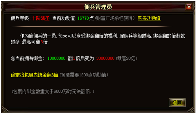 绑金翻倍功能(2级开放):每天有1次机会可以消耗功勋值,使背包中的绑定金币翻倍!