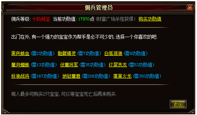 购买宠物功能(3级开放):可以通过佣兵功能消耗功勋值购买各种强力宠物帮助战斗,同时最多可存在两只宠物。