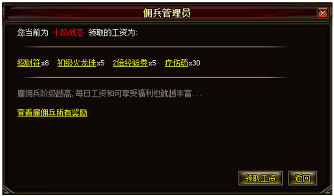 领取工资功能(1级开启):拥有佣兵后每天可以领取工资福利,福利内容视佣兵等阶而定。