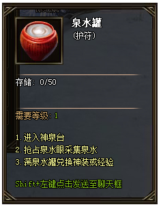 活动规则:进入场景玩家可以找NPC购买泉水灌,将泉水灌装备在护符出,在地图内抢占位置进行装泉水,当泉水灌的持久满了即表示该罐子已经满了泉水。