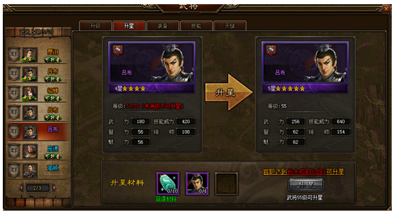 b) 升星:武将升到满级后,就必须要对武将进行升星才可以继续升级。