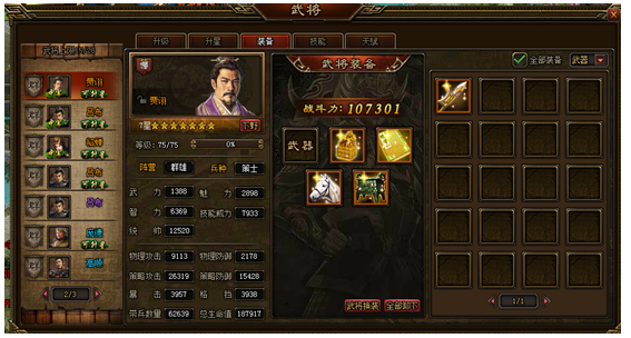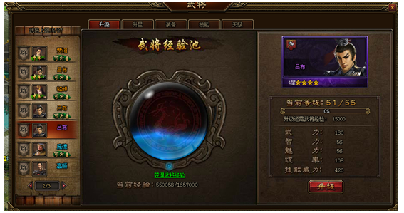 a) 升级:点击升级按钮后,系统就会自动从武将经验池里抽取武将经验补充给武将,使武将提升等级。武将提升等级后属性会获得大幅度成长。