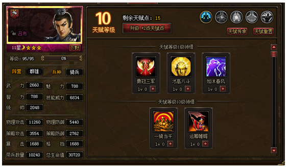 e) 天赋:花费银两升级天赋等级后可以获得天赋点。天赋点用于提升天赋技能等级。武将到达10星开放天赋功能。