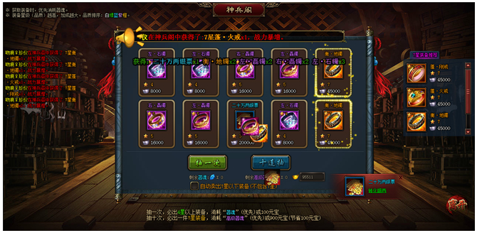 神兵阁为您提供了快速获得高星首饰的唯一途径。只需要轻轻一点,各部位的高星首饰立即进入您的背包,助您在横扫天下中如虎添翼!