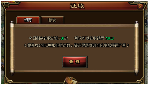 同过官府的征收菜单可以收取银两和粮食,收取的数量与名居等级和农田等级有关,民居和农田等级越高,增收的资源越多。