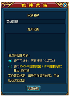 1、家族建立:玩家等级达到30级且当前未加入家族,可花费3万非绑定铜钱(15不绑定元宝)建立,或使用一个宗族令建立家族,宗族令可在商城中购买。